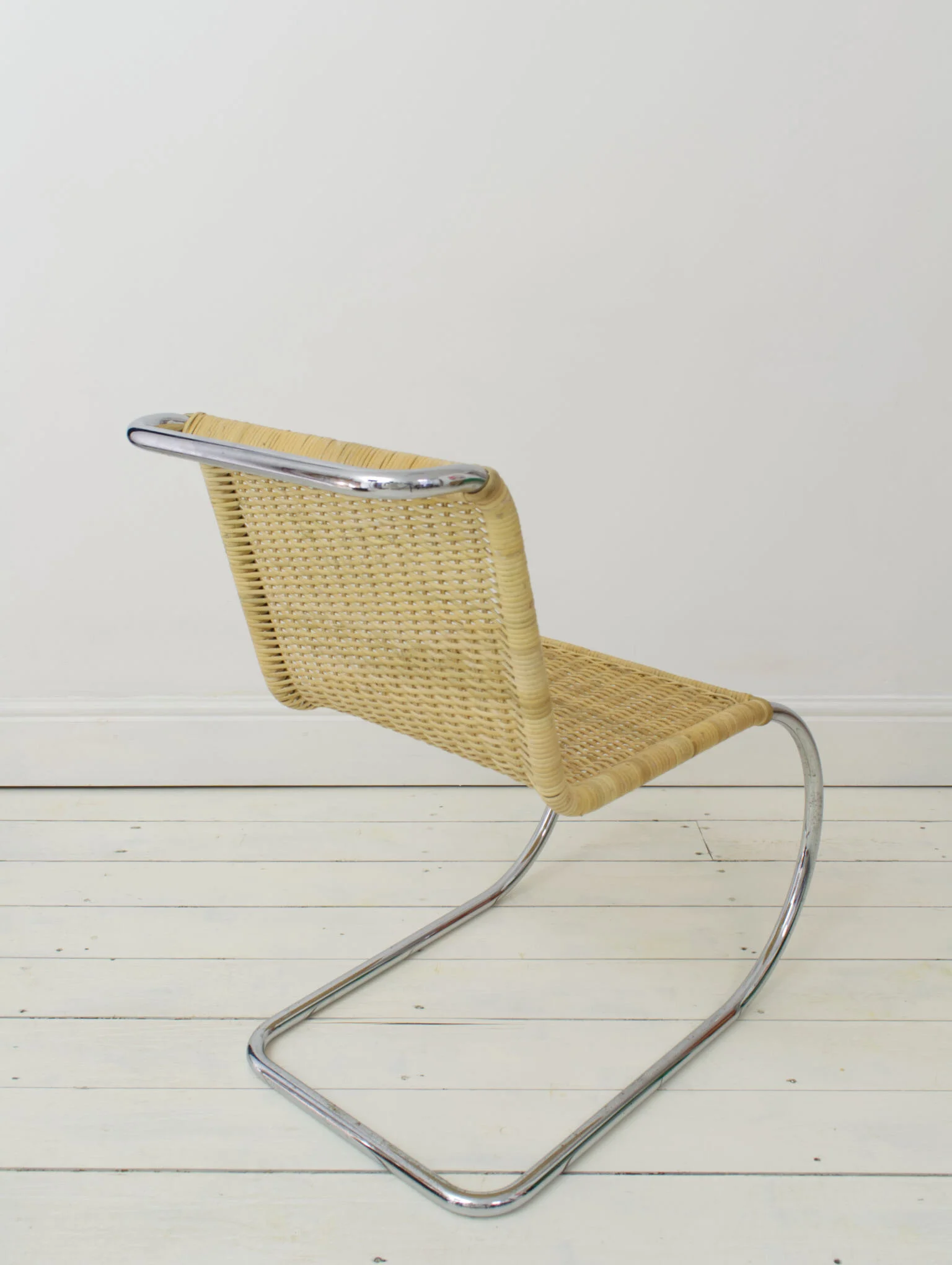The MR10 has become an iconic chair often used to illustrate the exemplary times from which it originates. Mies van der Rohe embraced the advances of industrial material production and elegantly exploited its unique characteristics. The MR series of chairs, though iconic, were not the first to employ tubular steel or even a cantilever in chair design. Marcel Breuer first used tubular steel for the Bauhaus canteen at Dessau followed by the skeletal B3 / Wassily armchair. Controversially Mart Stam is said to have brought the idea of a cantilevered tubular steel chair to a meeting at the Bauhaus Werkbund in 1926 and Mies van der Rohe was so taken by the idea that he immediately jumped straight into developing his own version of the concept. Mies was unique in employing, so beautifully, a “continuous form of tubular steel that is like a drawing made in three dimensional space” (Nicholas Fox Weber, The Bauhaus Group) and these continuous lines created a “springiness analogous to the movement of a rocking chair, something entirely new in sitting furniture” (Now Sit Me Down, Witold Rybczynski). First produced in 1927 by Berliner Metallgewrbe, the MR-10 was showcased at the Die Mode der Dame exhibition in Berlin and installed at Mies’s model apartments in Stuttgart. The cane version of the chair came in 1928 after the original leather-slung chairs of the previous year. They were included in the exposition at the Barcelona World's Fair of 1929 where the famous pavilion was installed. Thonet took over production in the early 1930’s and the MR chairs were the most expensive in the catalogue. The set we have here are from the 1977 reissue by Knoll which was in conjunction with MOMA’s exhibition Mies in New York City. M//M
